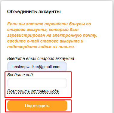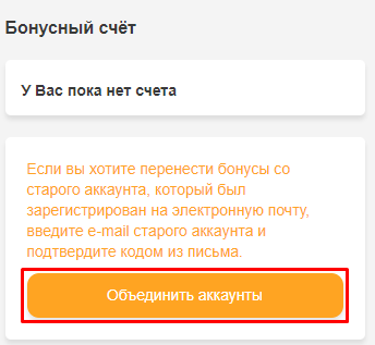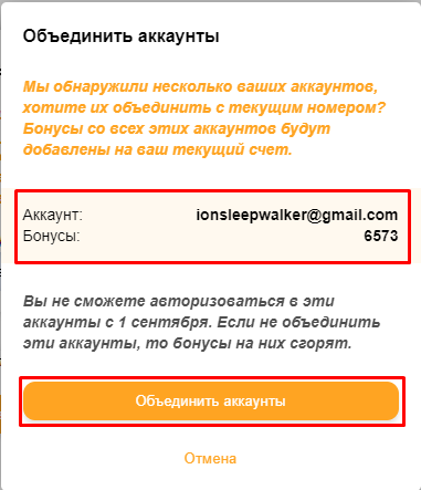 Откроется окно со всеми аккаунтами, которые связаны с этой почтой, и сумма бонусов на этих аккаунтах. Далее нужно нажать накнопку объединить аккаунты.