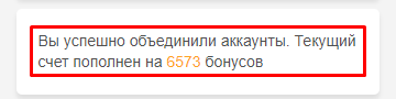 Далее пользователя перекинет в личный кабинет, где под операциями по счету будет окно с текстом, о том, что аккаунты успешно объединены и добавленная сумма бонусов