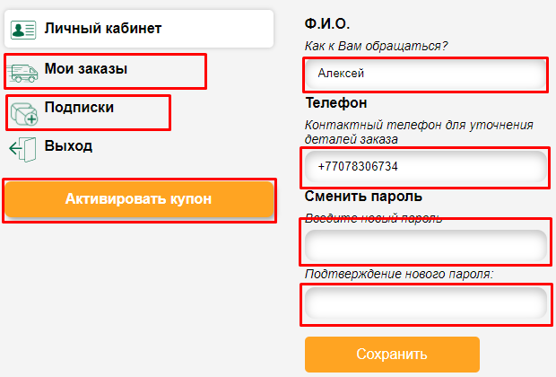 4. Далее откроется личный кабинет, где можно посмотреть информацию по заказам, подписки на товары, активировать купон, сменить пароль, телефон и имя для обращений.
