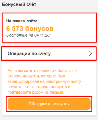5. Также тут видны данные по состоянию бонусного счета, можно посмотреть все операции по бонусному счету и объединить аккаунты.