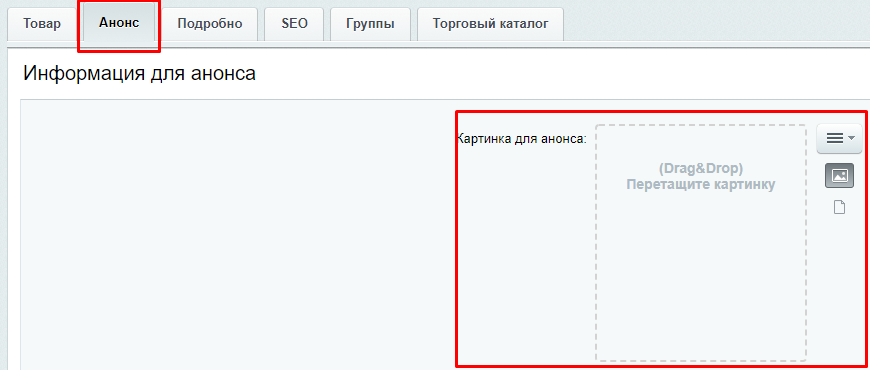 6. Если есть фото самой коробки товара или презентационная фотография, ее добавляем во вкладке анонс в поле Картинка для анонса и во вкладке товар, в графу Дополнитльные Фотографии(Она же будет отображаться везде, вместо детальной).