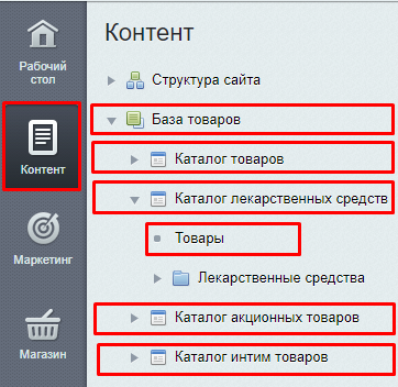 2. Для того чтобы создать товар, нужно знать к какому разделу он относится: Лекарственные средства, Интим товары или Каталог товаров (к нему относятся все остальные разделы). Нужно перейти по ссылке https://aptekaplus.kz/bitrix/admin, далее в панели администратора в левом меню выбираем вкладку Контент, далее вкладка База товаров, после (например) Каталог лекарственных средств и нажимаем на Товары.