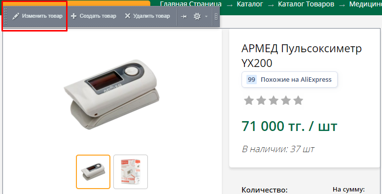 2. Далее навести курсор на товар, появится тонкая рамка вокруг товара и несколько вкладок, выбираем "Изменить товар"