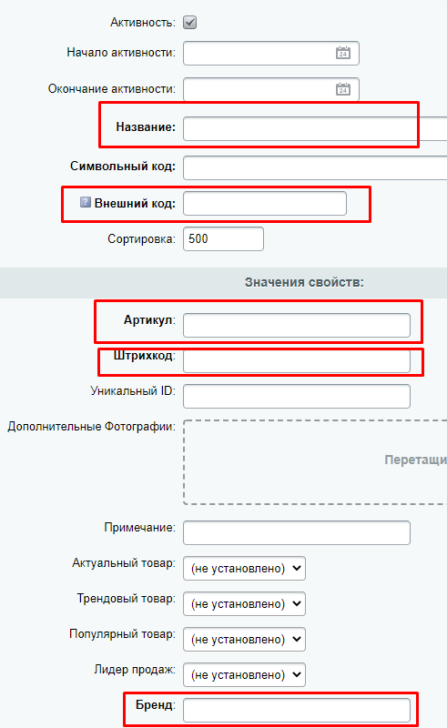 4. Заполняем параметры товара. Обязательными будут Название товара, артикул, внешний код, штрихкод и брэнд.