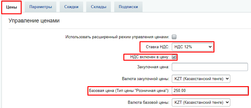 9. Далее во вкладке Торговый каталог, стандартно откроется вкладка Цены и тут нужно добавить Ставку НДС(Без НДС или НДС 12%). Если НДС есть, то ставим галочку НДС включен в цену. И вписываем цену в графу Базовая цена (Тип цены "Розничная цена"):
