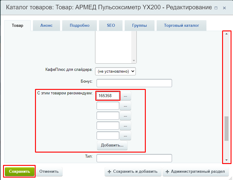 4. Далее переходим в товар, к которому нужно добавить связанный и проделываем те же действия наводя на товар и выбирая "Изменить товар". В конце открывшегося окна будет поле "С этим товаром рекомендуем". Вписываем ID, который мы скопировали (можно использовать сочетание клавиш Ctrl + v). Далее нажимаем кнопку Сохранить