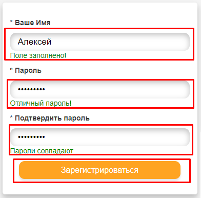 6. Далее в открывшейся форме надо будет заполнить поля имени, пароля и подтверждение пароля и нажать на кнопку зарегистрироваться