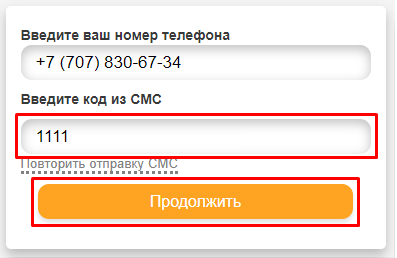 5. На указанный телефон придет СМС с четырехзначным кодом, надо его ввести и нажать на кнопку Продолжить